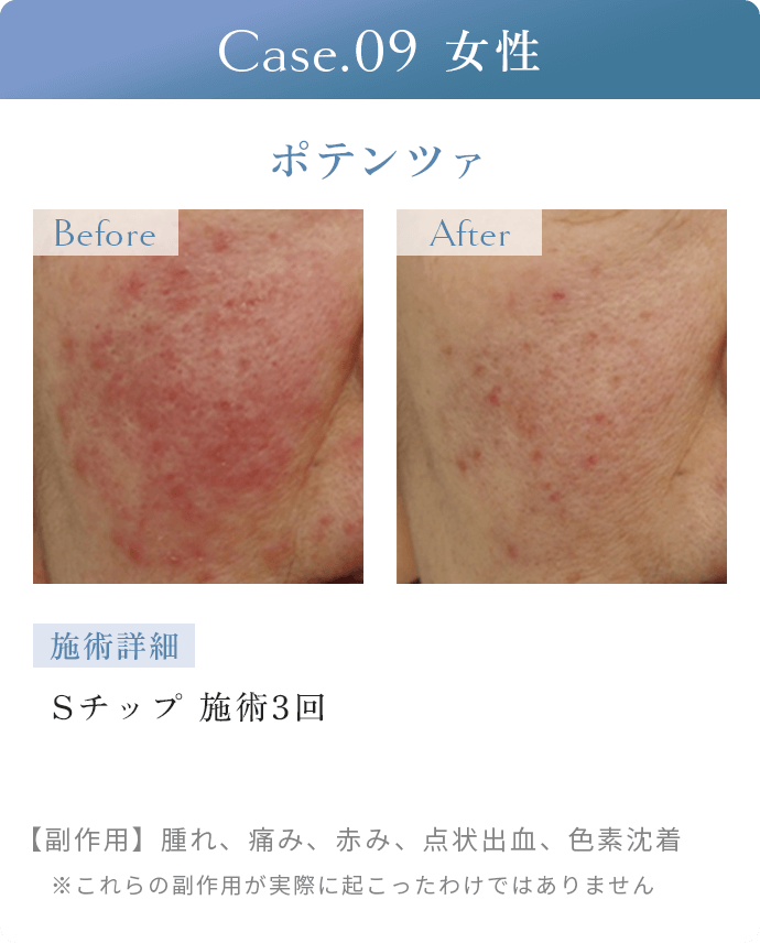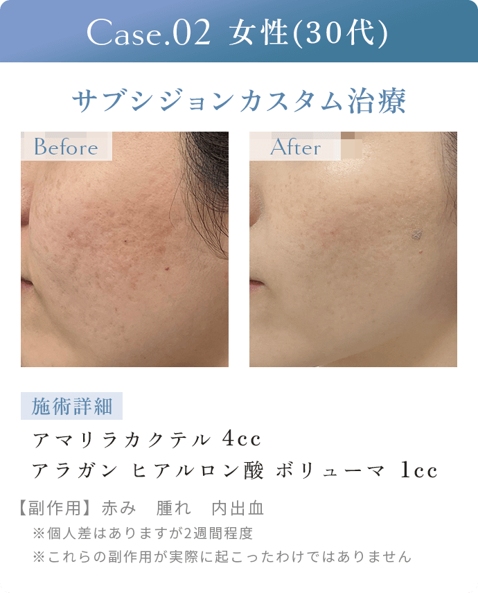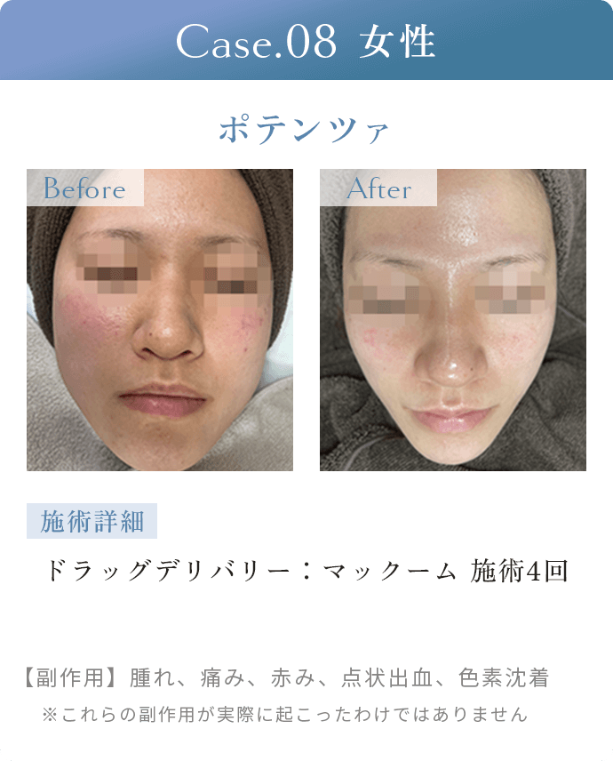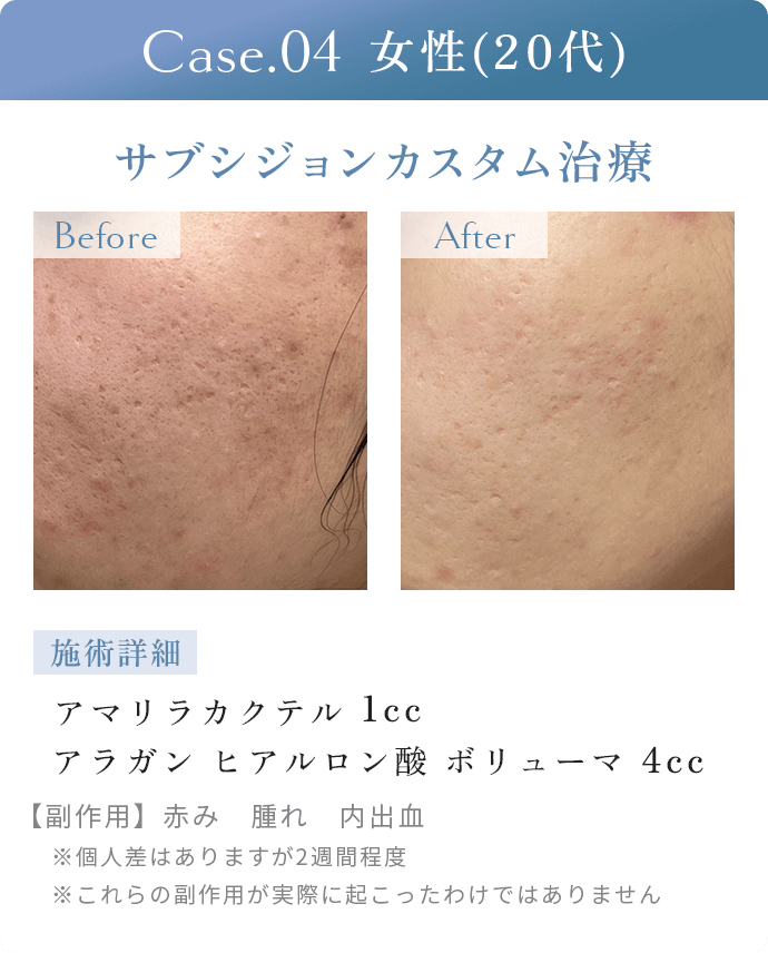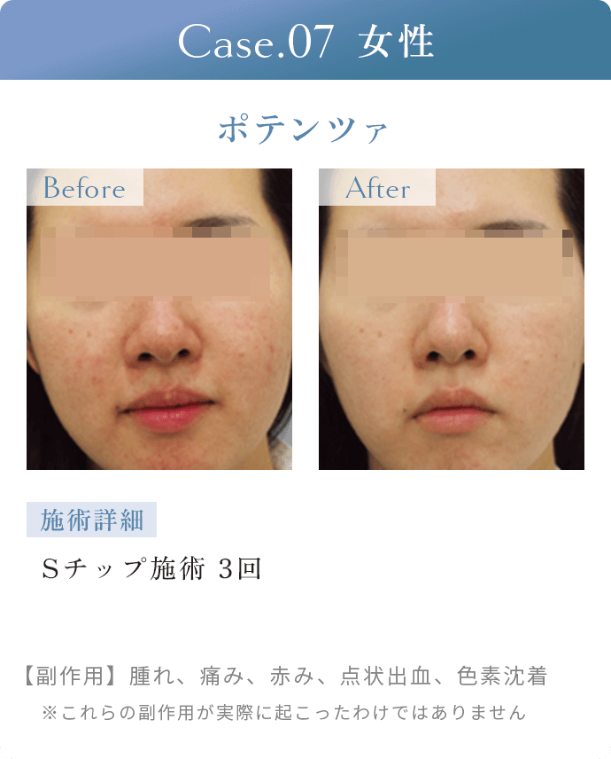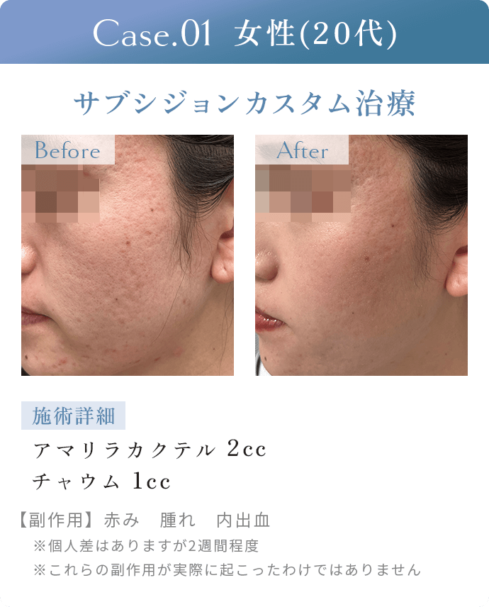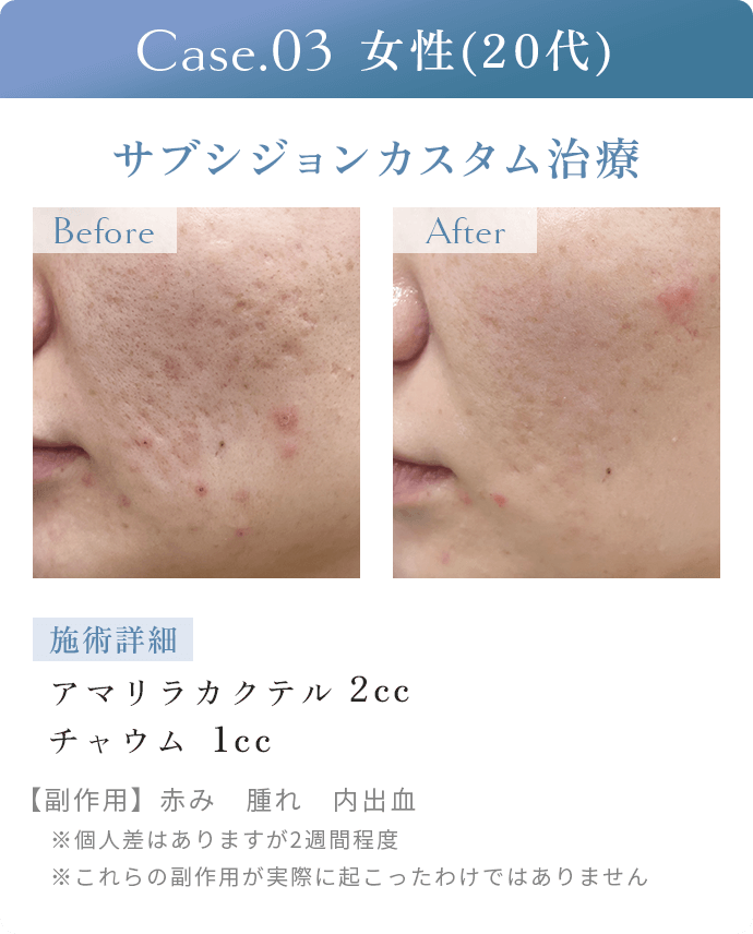 施術後は患部に痛みや赤みが現れる場合がありますが、1-2日でほぼ消失します。メイクは翌日から可能ですので、日常生活に支障なくお過ごしいただけます。
